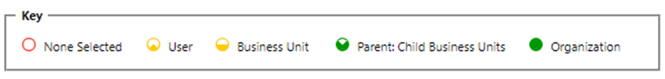 In Dynamics 365, this is indicated by the degree of fill and color of the little circles against each entity for each privilege.