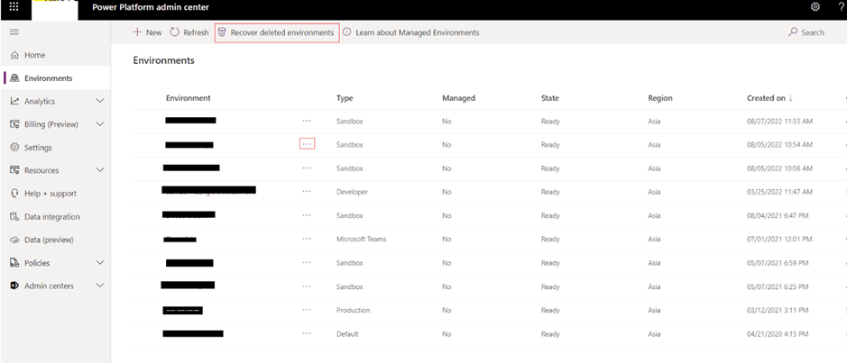 Recover deleted environments – To recover the environment which is deleted