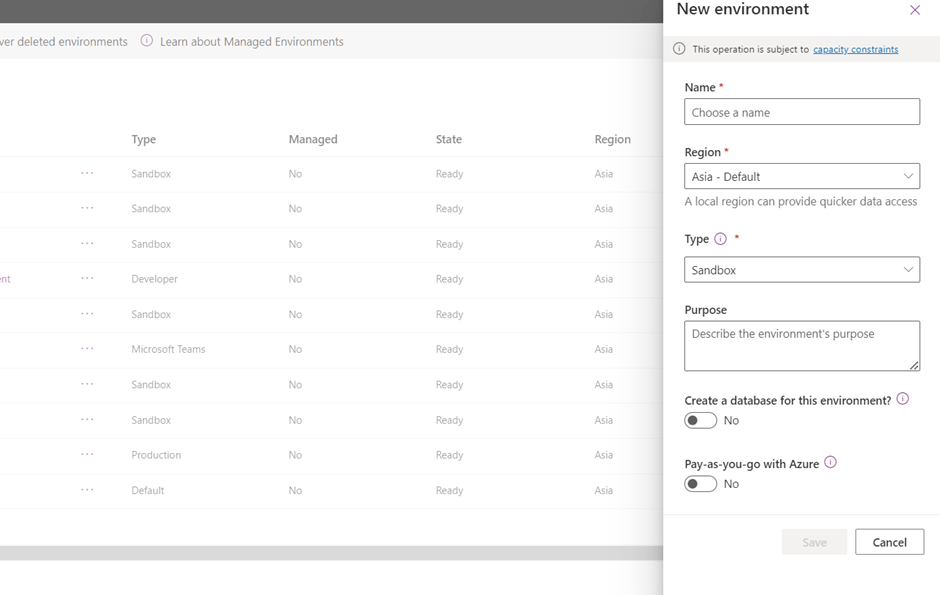 - When user click on Environments in power platform admin center, they can see screen as per below which has options for