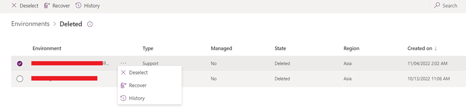 - When user click on recover deleted environment it will display list of deleted environments. When user click on … it displays option to Recover & History as per below snapshot