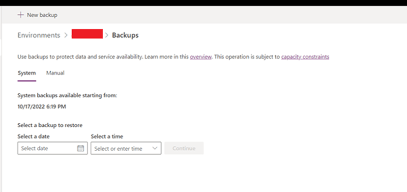 User can create new backup using + New Backup along with that user can see system backups by entering date and time / manual backup taken by the user.