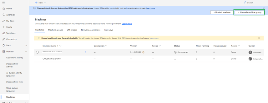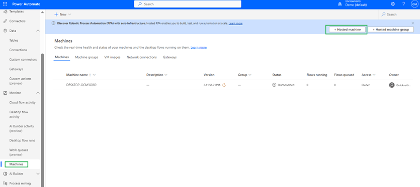 Hosted machines allow you to build, test and run attended and unattended desktop flows without providing or setting up any physical machines.