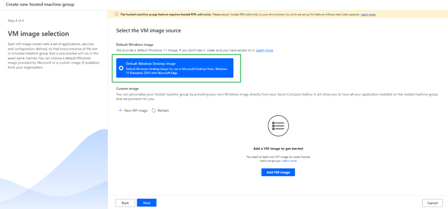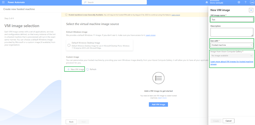 When you click on + New VM Image you will see an option to select name along with options to use with – 1. Hosted Machine 2. Hosted Machine Group 3. Both