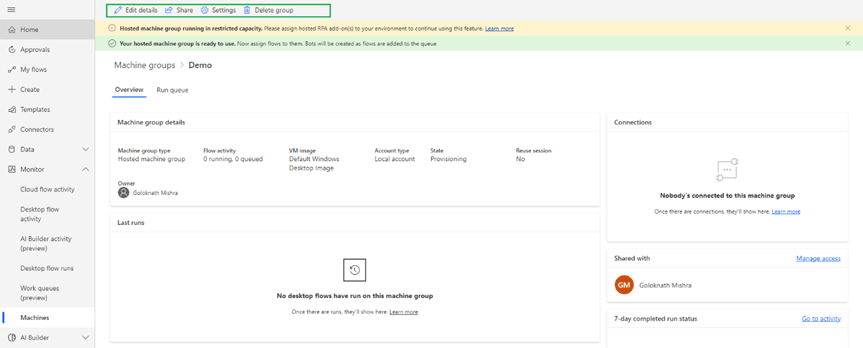 Once hosted machine groups are created you can see the status as below