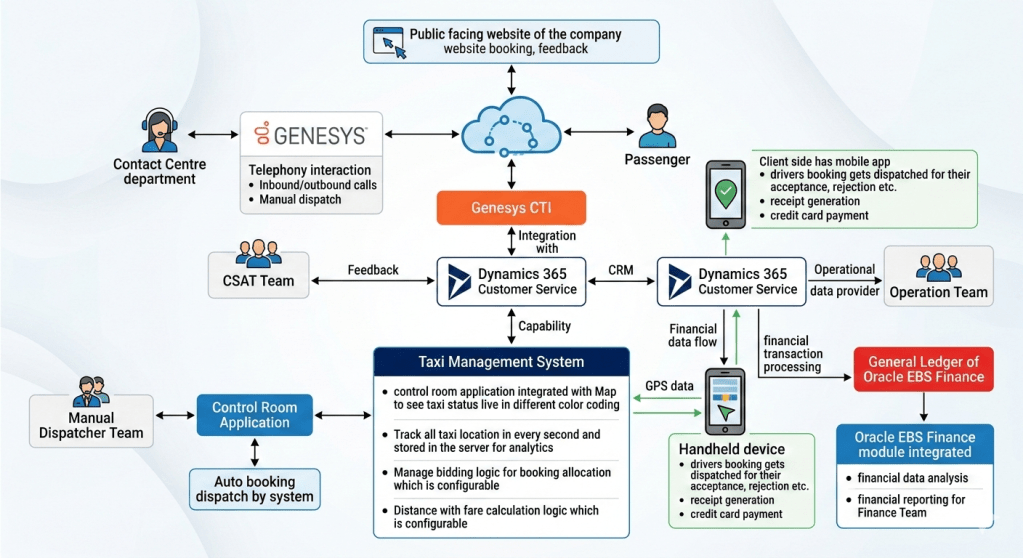 The core value of this ecosystem is not in the individual “best-of-breed” tools—Genesys for telephony, Microsoft Dynamics 365 for CRM, Oracle E Business Suite(EBS) for finance—but in their integration. D365’s role as the central operational data provider connects the front-end user experience (passenger, driver, agent) directly with core business logic (bidding, fare) and ultimately with enterprise-grade financial control (Oracle GL). The specialized Taxi Management System logic in Layer 6, fed by precise, real-time telemetry from Layer 3, ensures that the enterprise can make optimal, data-driven decisions at a high velocity.