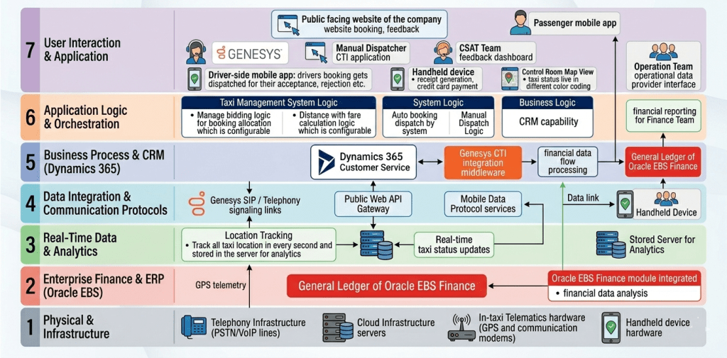 This article provides a comprehensive, deep-dive exploration of such an ecosystem, as presented in the accompanying 7-layer architecture diagram. This architecture, inspired by the OSI (Open Systems Interconnection) reference model, is designed for scalability, modularity, and, most importantly, seamless data integration. It showcases how a modern taxi enterprise can leverage a suite of best-in-breed technologies—including Genesys, Microsoft Dynamics 365, Oracle E Business Suite (EBS) Finance, and specialized taxi management software—to create a unified platform for enhanced efficiency, superior customer and driver experiences, and robust financial control.