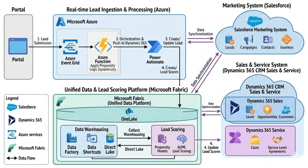- Unified Data & Lead Scoring Platform (Microsoft Fabric): The analytical heart of the system, consolidating data from all platforms into a single logical data lake (OneLake) for data warehousing and to fuel advanced AI/ML lead scoring.